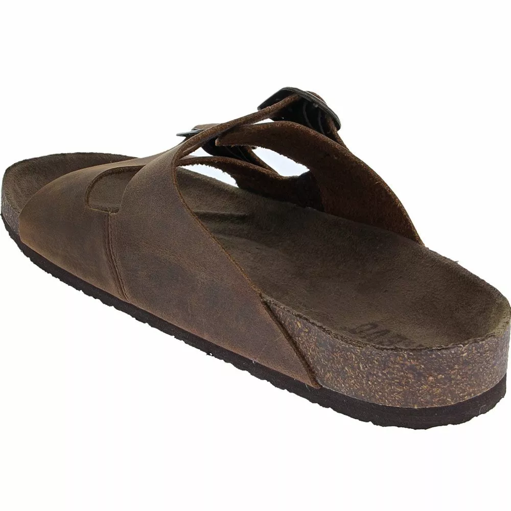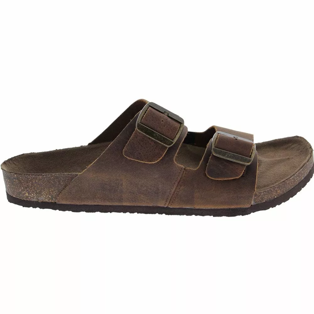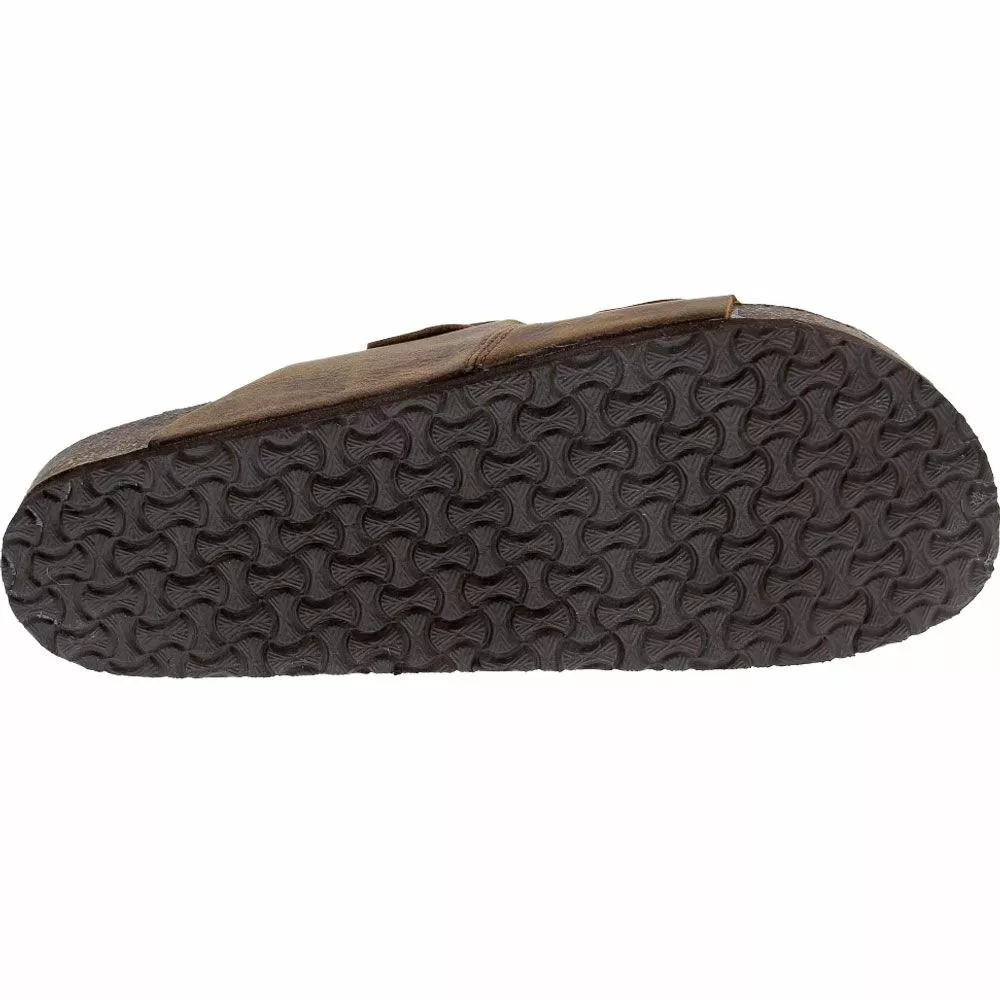 Crevo Sedono Mens Slide Sandals. Dress them up or dress them down, but you will want to live in these comfy mens sandals. The contoured footbed has been carefully molded to fit the human foot like a custom shoe. The outsole is made of sturdy and flexible EVA material for sure footed peace of mind. Uppers are generously constructed of genuine leather accented with topstitching and fastened with two adjustable buckle straps. These comfortable, easy-on brown leather sandals are a must-have for laid back casual wear or casual Fridays at the office.