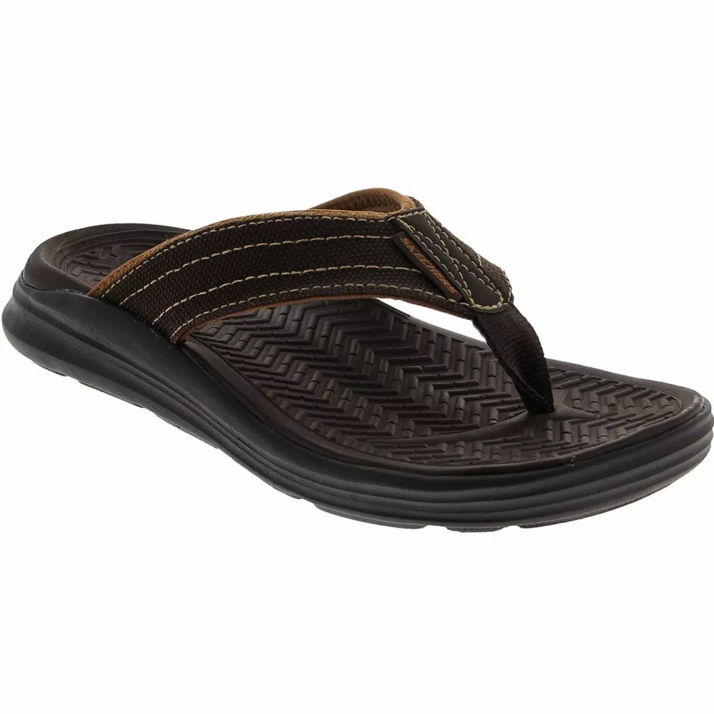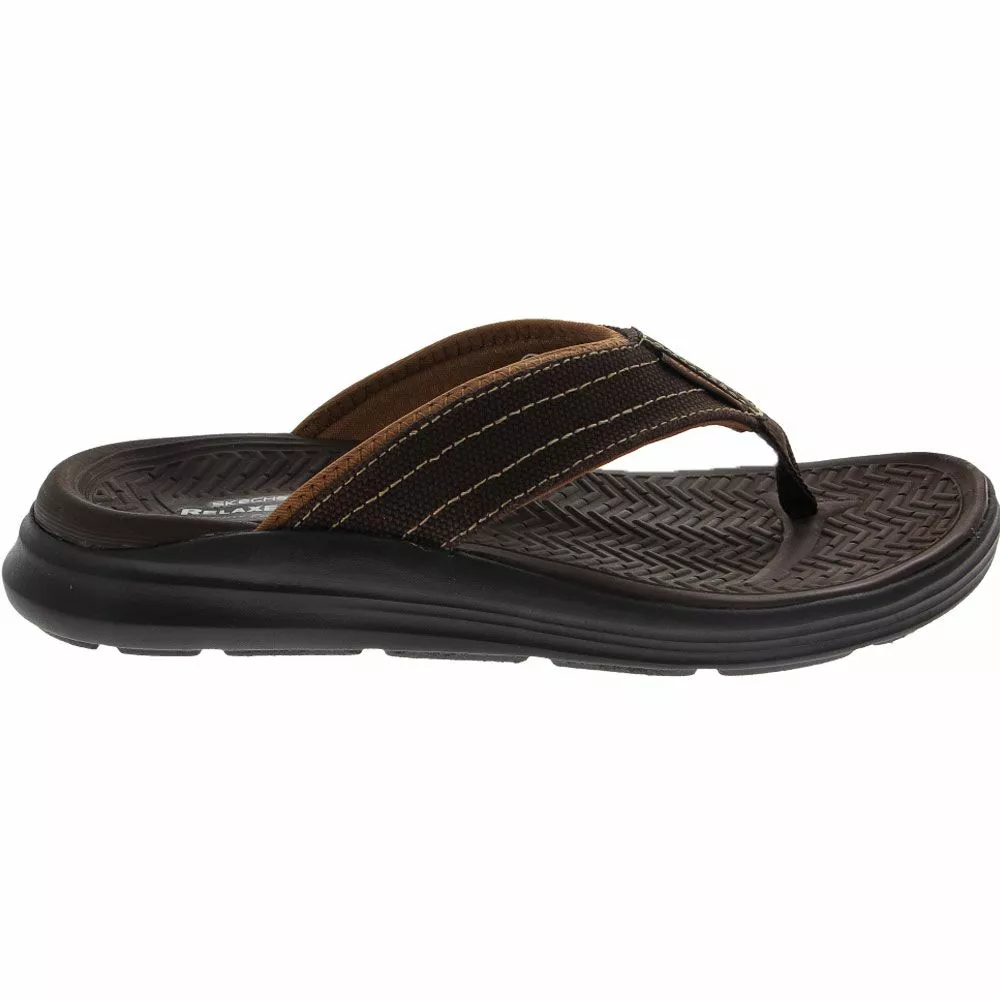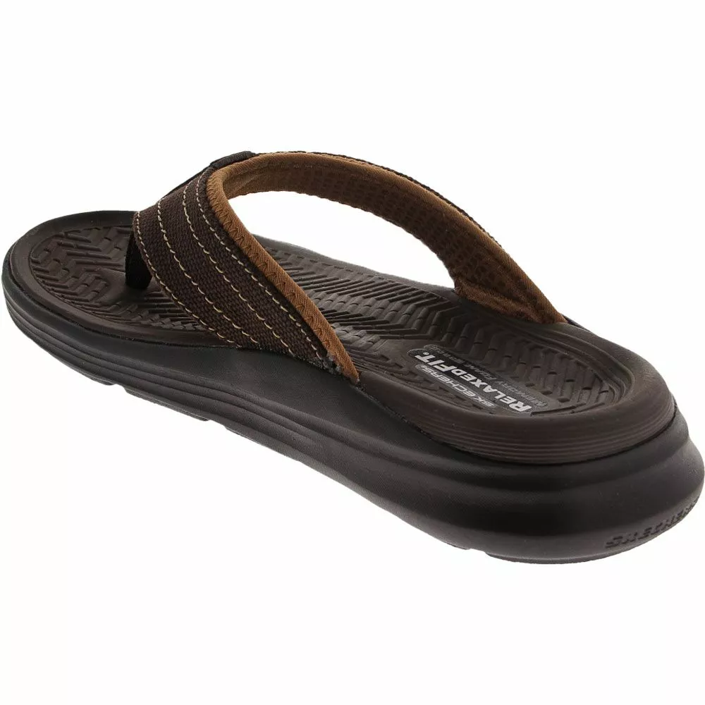 Skechers Relaxed Fit: Sargo – Wolters Mens Thong Sandal Flip Flops. Enjoy that laid-back summer feeling with these sturdy and comfortable mens flip flop sandals. The upper straps are constructed of soft woven canvas with contrast edging and stitched accents. A rubber outsole offers flexibility and traction while the contoured and textured memory foam footbed is soft on your feet. The midsole is also flexible, and gives you excellent support without added weight. Memory Foam 360 padding lines the strap for an extra cozy feeling.